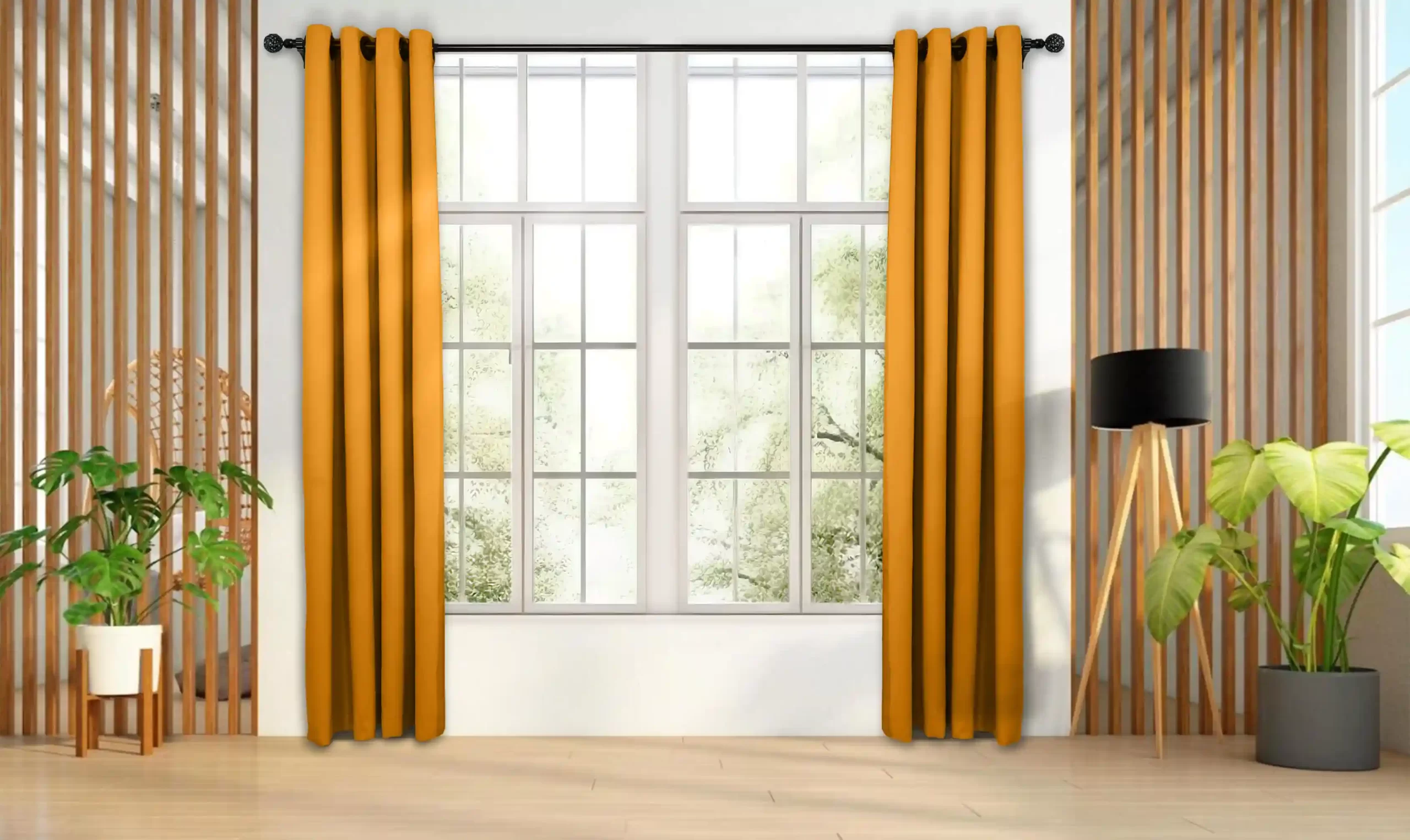 • ست با متریال طبیعی: ترکیب پرده نارنجی با چوب‌های روشن (بامبو)، حصیر و گیاهان سبز، یک دکوراسیون بوهمی (Bohemian) و الهام‌گرفته از طبیعت را می‌سازد.